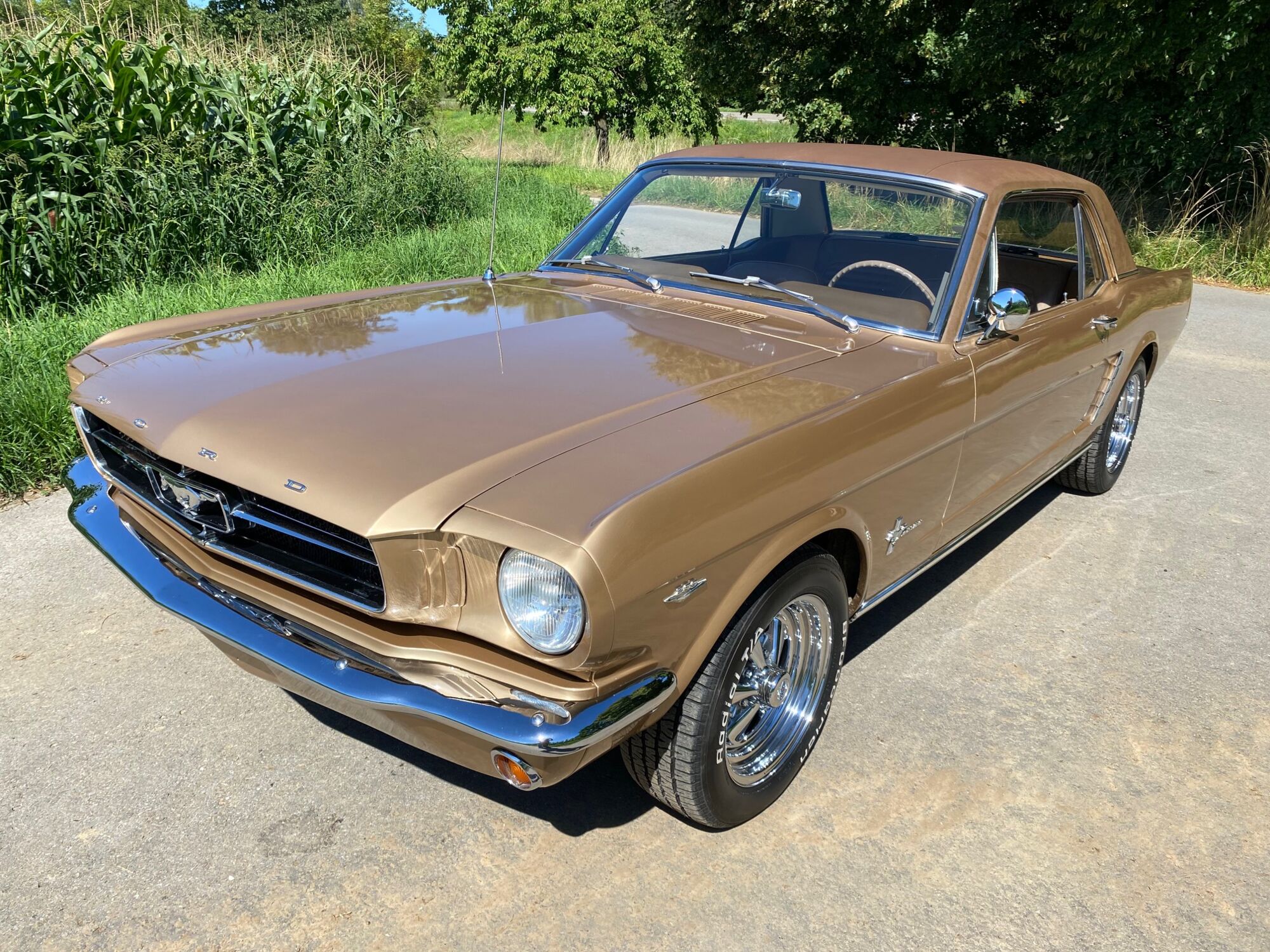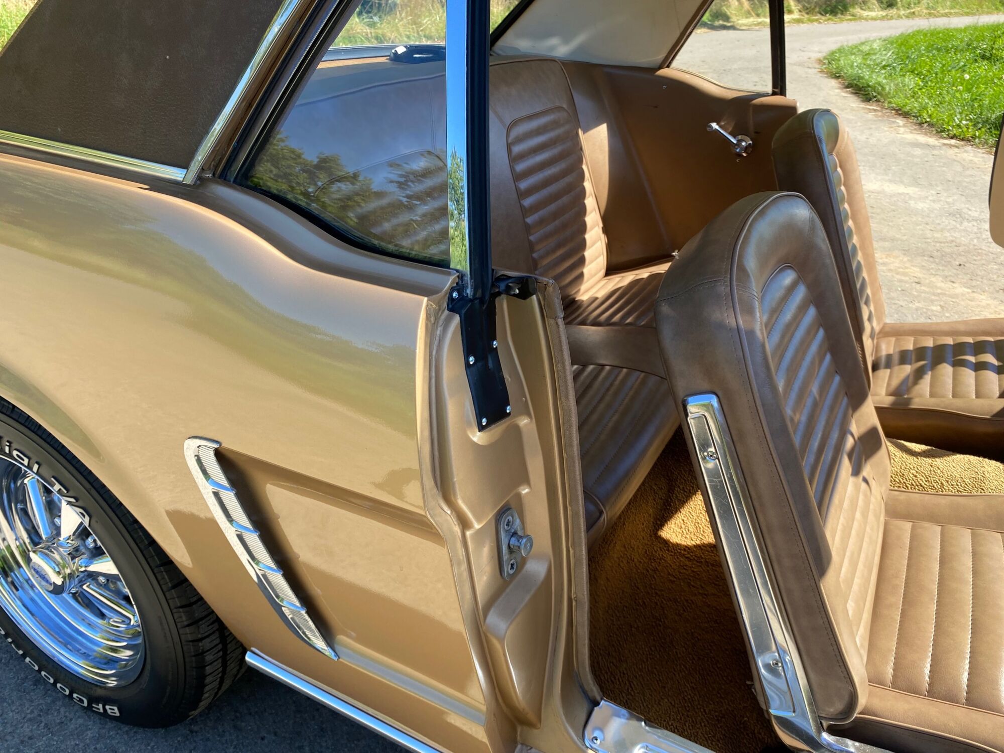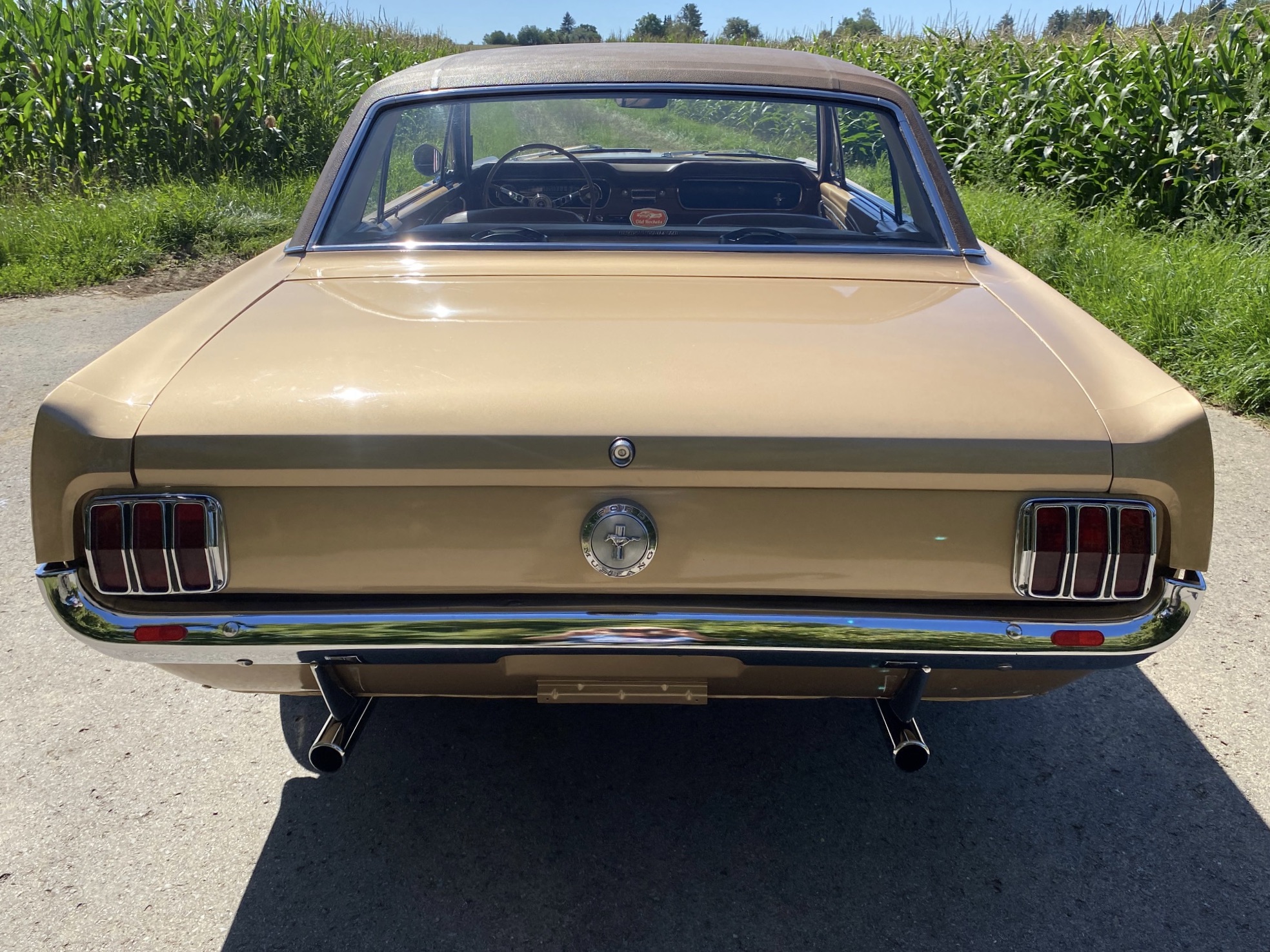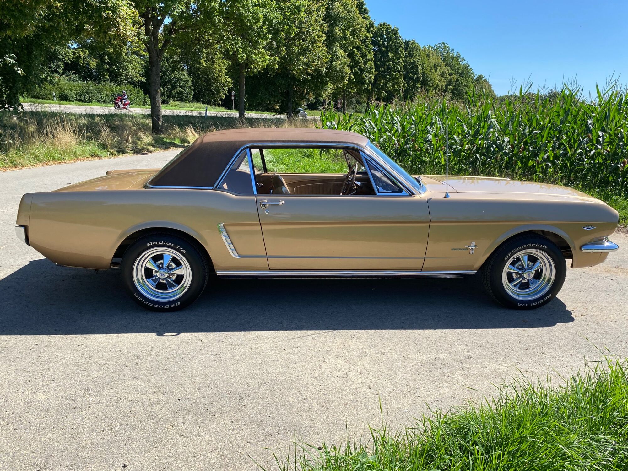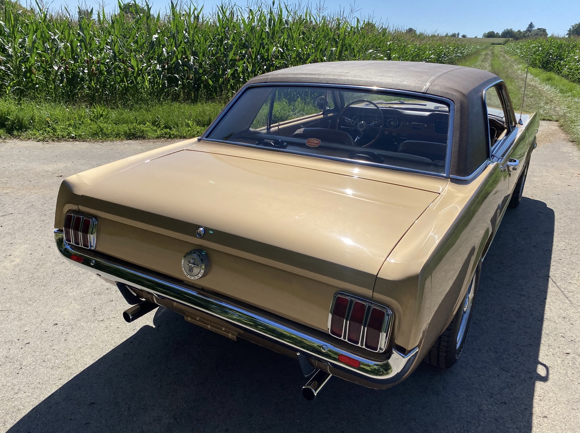 Buddy ist ein super schönes Pony mit einer sehr seltenen Lackierung in der Originalfarbe "Prairie Bronze", einem absolut passenden Vinyldach und dem I-Tüpfelchen, die farblich abgestimmte Palomino-Innenausstattung in hellem braun. Dazu ein brauner Teppich und glänzende, schöne Chromteile. Bei Karosserie und Technik gibt es nichts zu meckern, sogar eine Verlängerung der Sitzschiene wurde eingebaut. Eine Doppelrohr-Auspuffanlage sorgt für super Sound im Aussenbereich, das Retro-Radio mit den neuen Boxen kann Lieder aus den 60ern singen. Dieses waschechte Pony wurde jedenfalls mit sehr viel Geschmack ausgesucht.