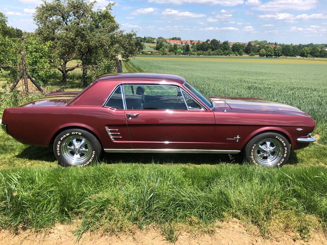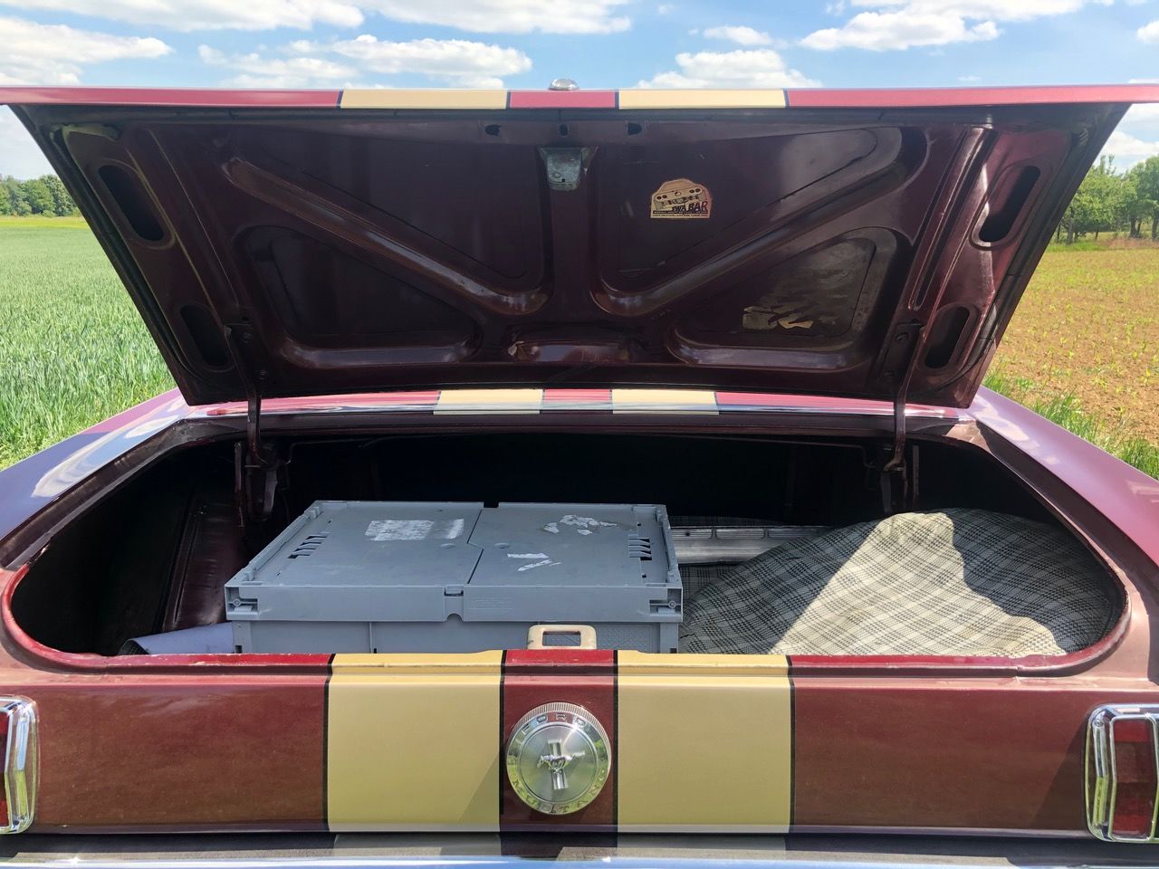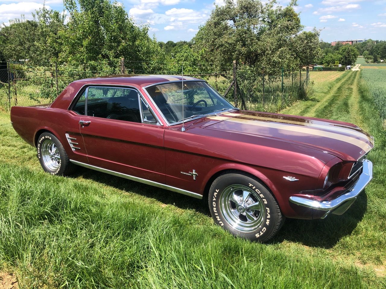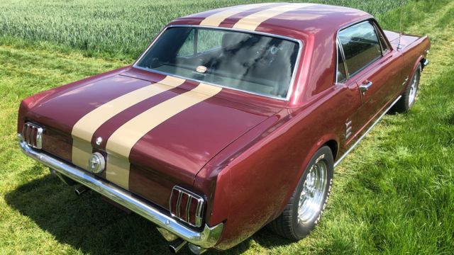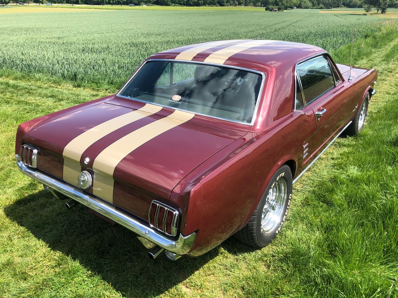 Barney ist schon seit einer Weile in Deutschland und bereits zugelassen, er hat sich als sehr zuverlässiges Pony bewiesen. C-Code, super schöne Cragar-Felgen, Servolenkung, Scheibenbremsen, Doppelauspuff mit coolem Sound und dazu die goldenen Rennstreifen in Vinyl, darunter ein schöner Lack in originaler Farbkombi. Aber nicht genug, Barney bringt all seine Rechnungen und Belege mit, sogar seine originale Verkaufsrechnung mit dem Protectoplate. Alle Begehrlichkeiten von Historien- und Technik-Fans werden hier erfüllt.