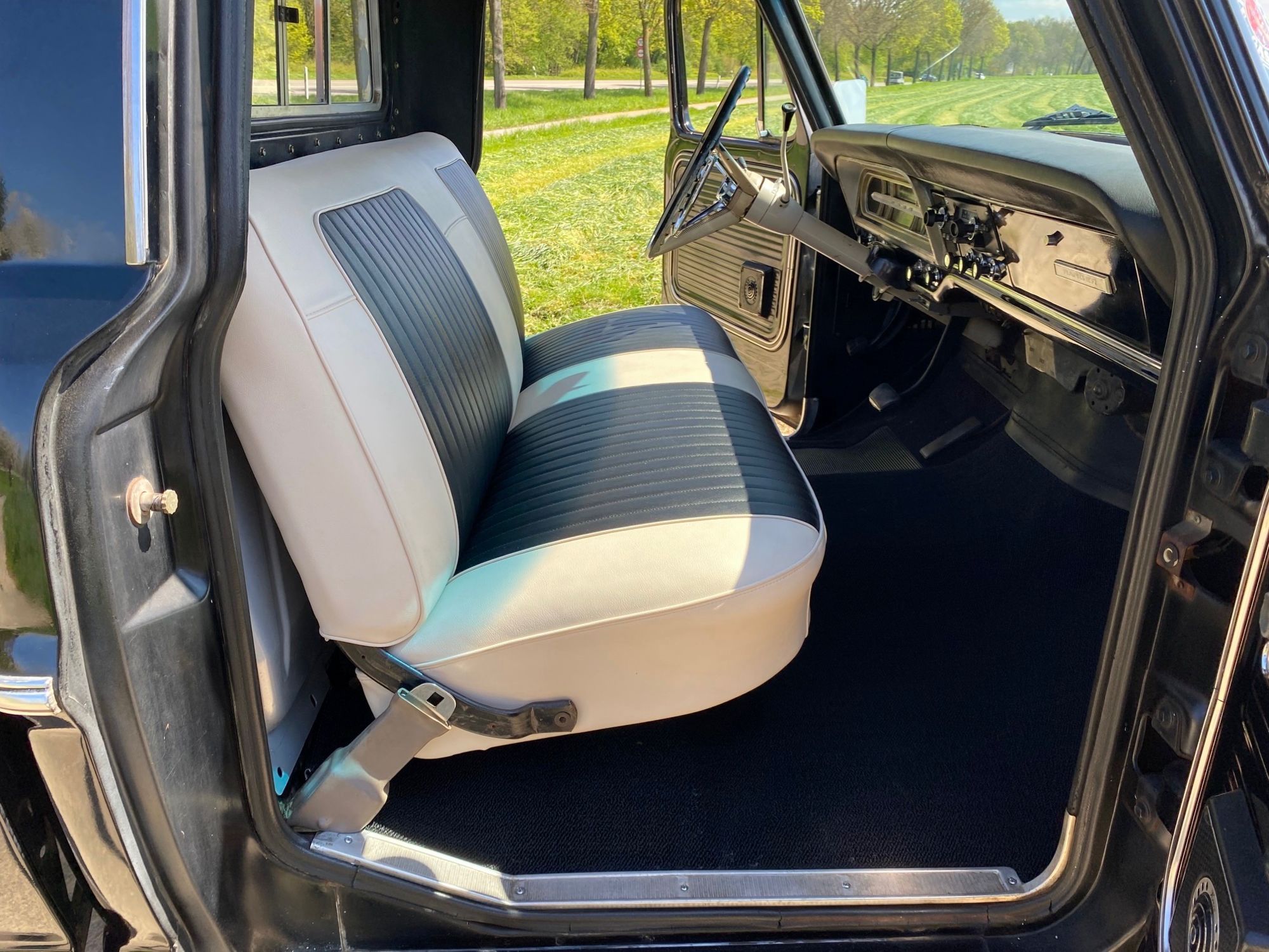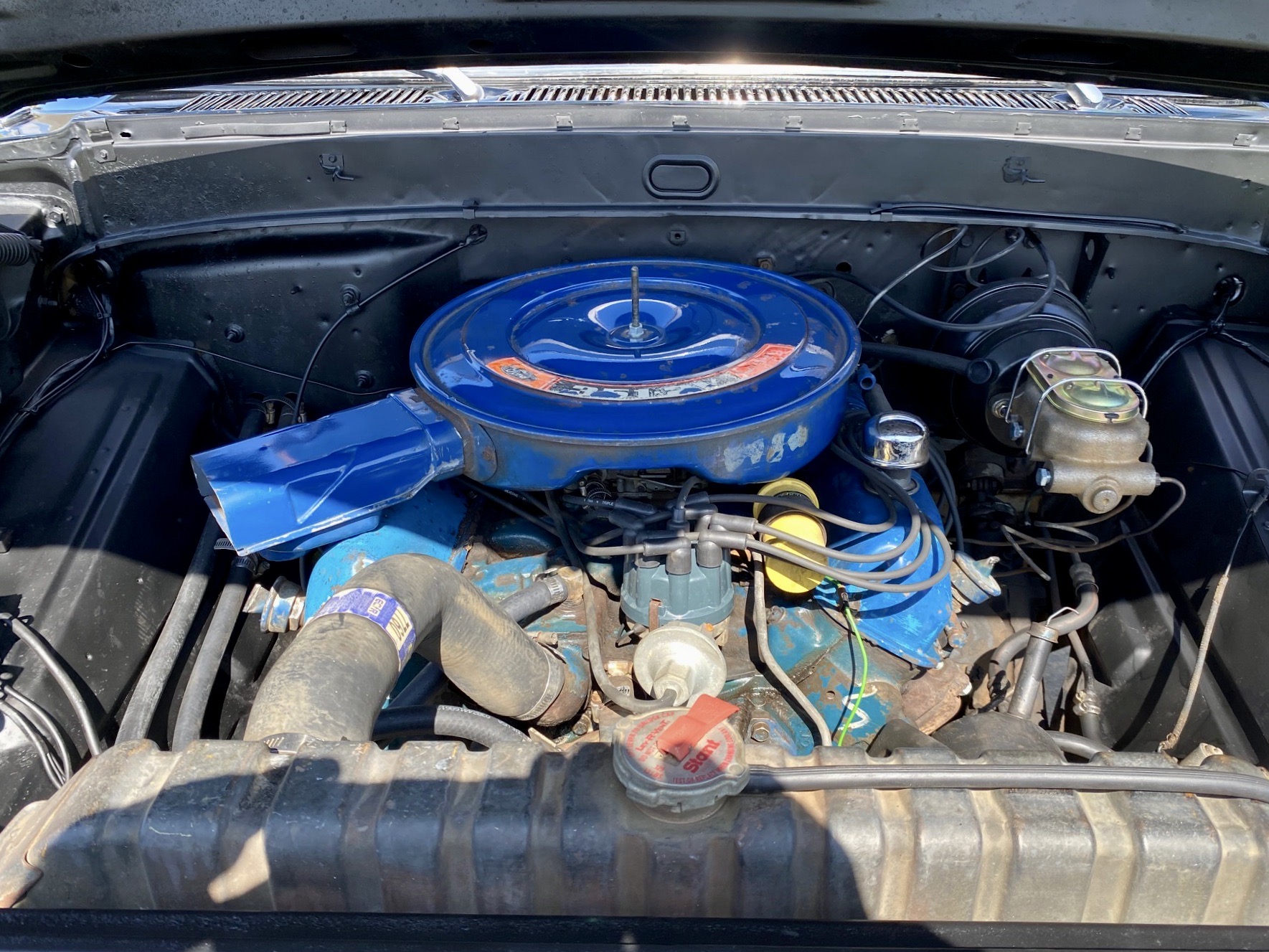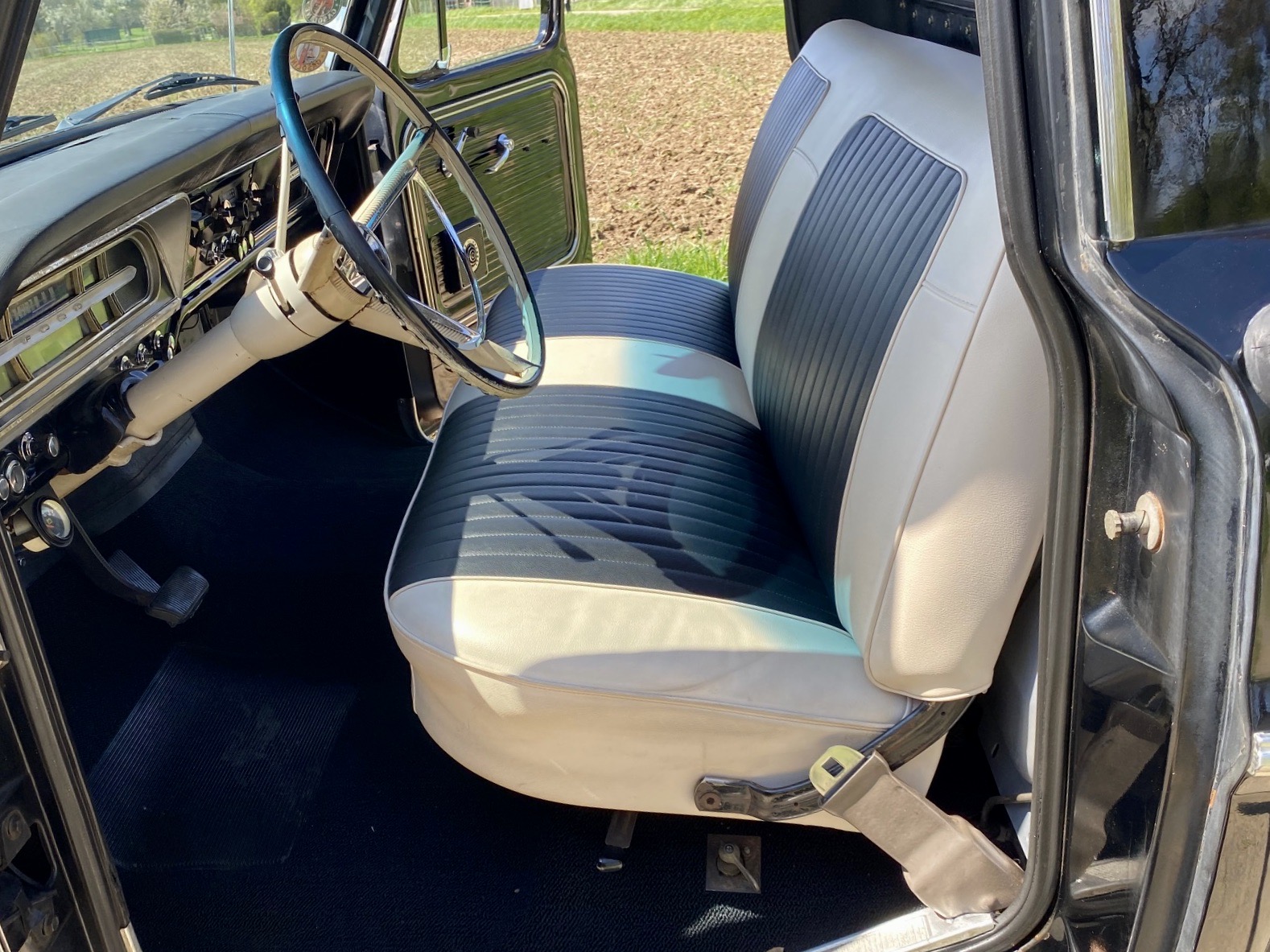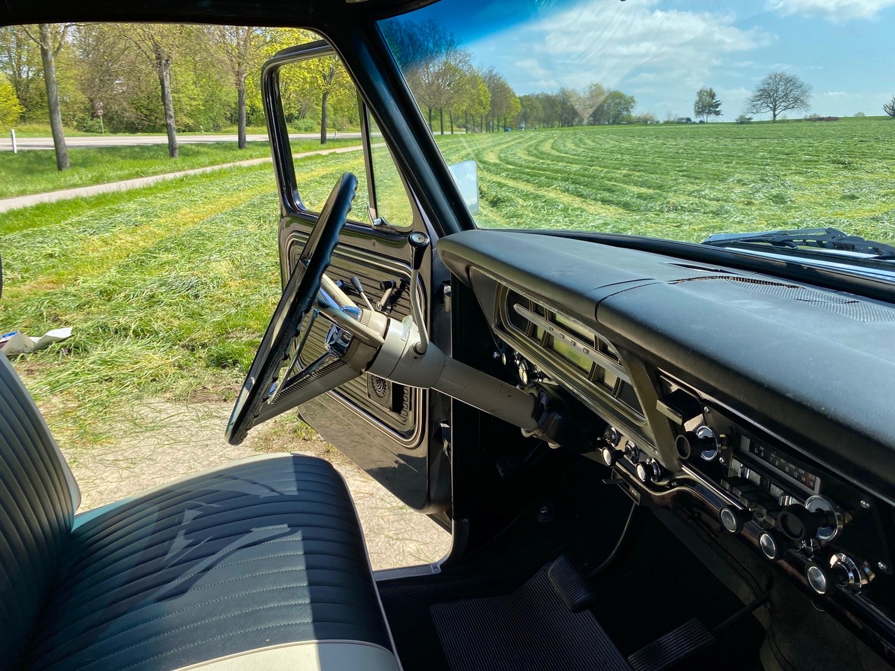 Unser Olli kommt aus dem sonnigen Kalifornien im originalen, schwarzen Lack & einem Black Plate. Er hat immer in trockenem Klima gelebt, seine Karosserie ist super schön erhalten und der Unterboden ist absolut ohne jegliche Durchrostungen. Man sieht dass er ein Leben hatte, dass er benutzt wurde, genau die Patina macht ihn aber sehr liebenswert. Das Herz ist ein 352 cui V8 big block Motor mit 5,8 Liter, angetrieben von einem automatischen Getriebe. Technisch wurde einiges investiert und die neu gepolsterte Sitzbank wartet auf einen begeisterten Driver.