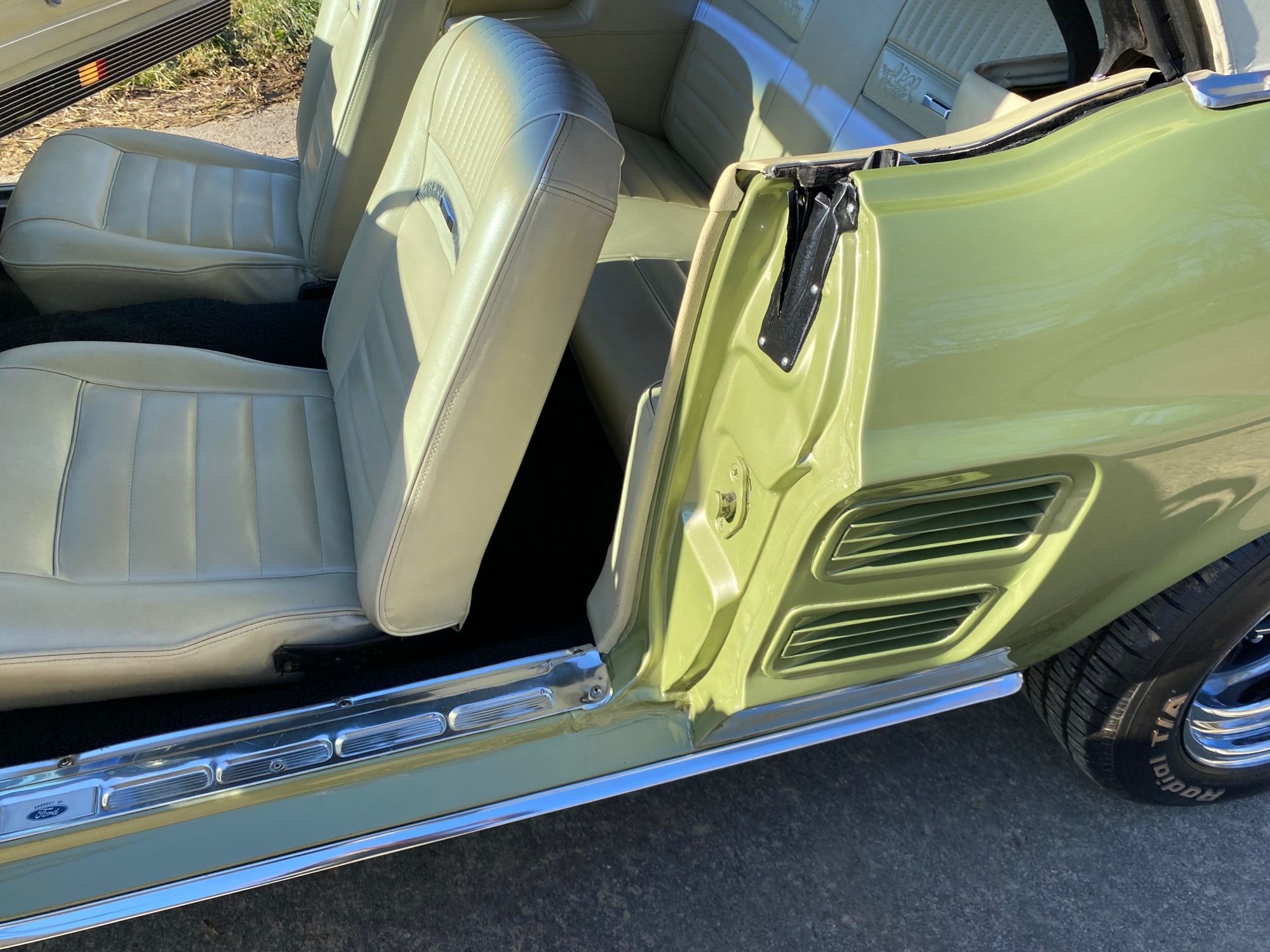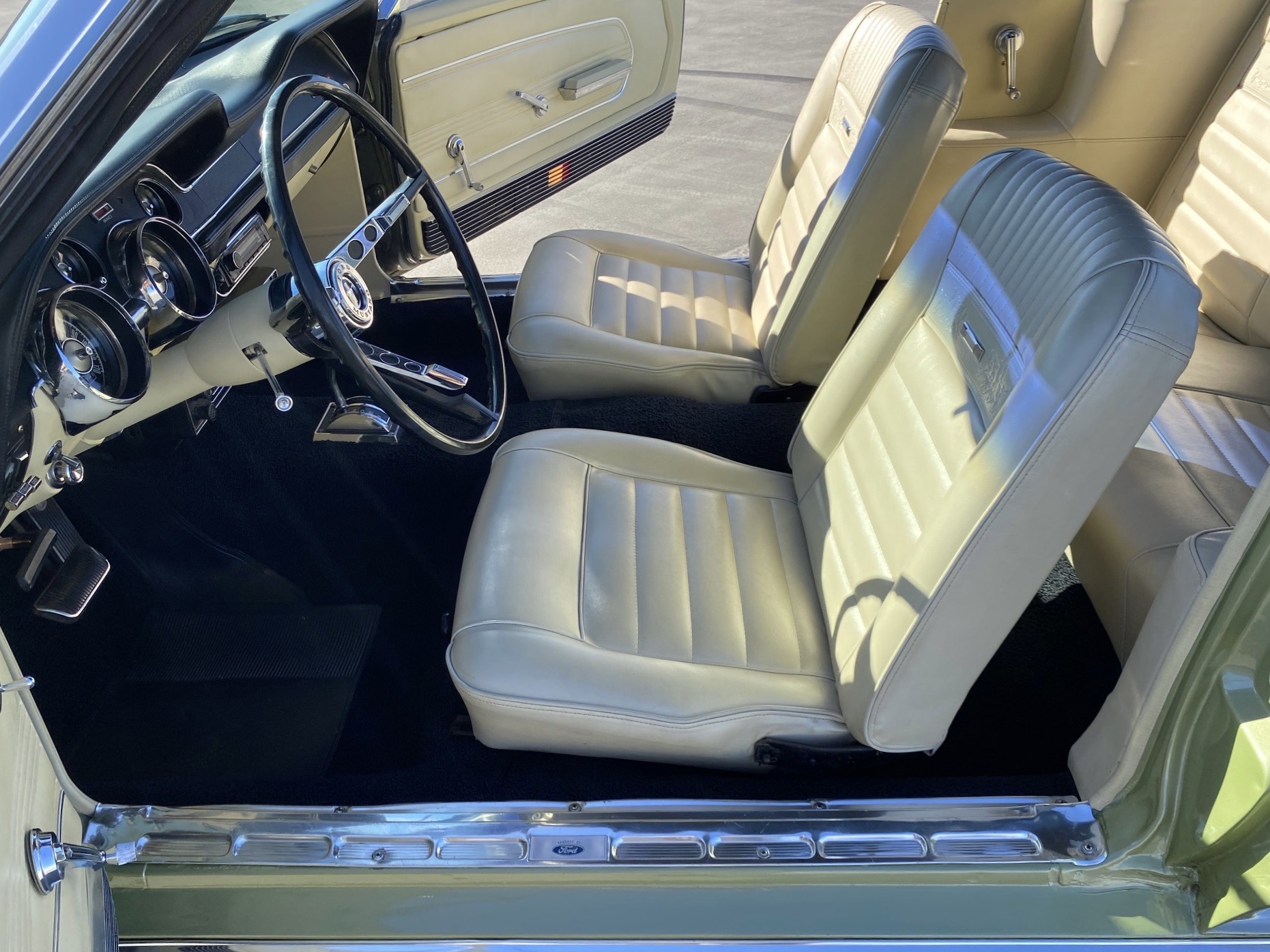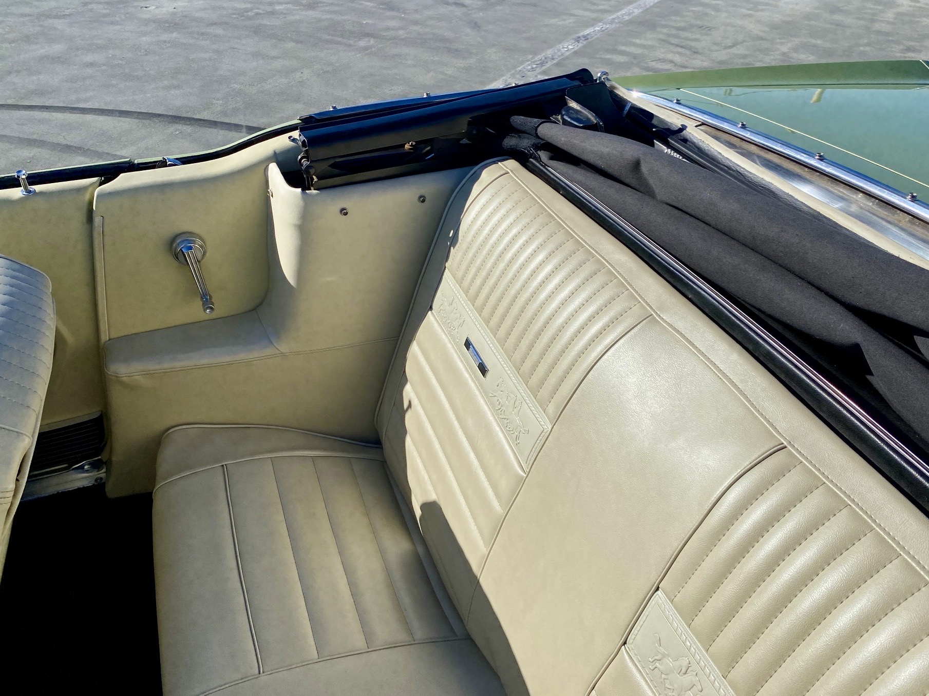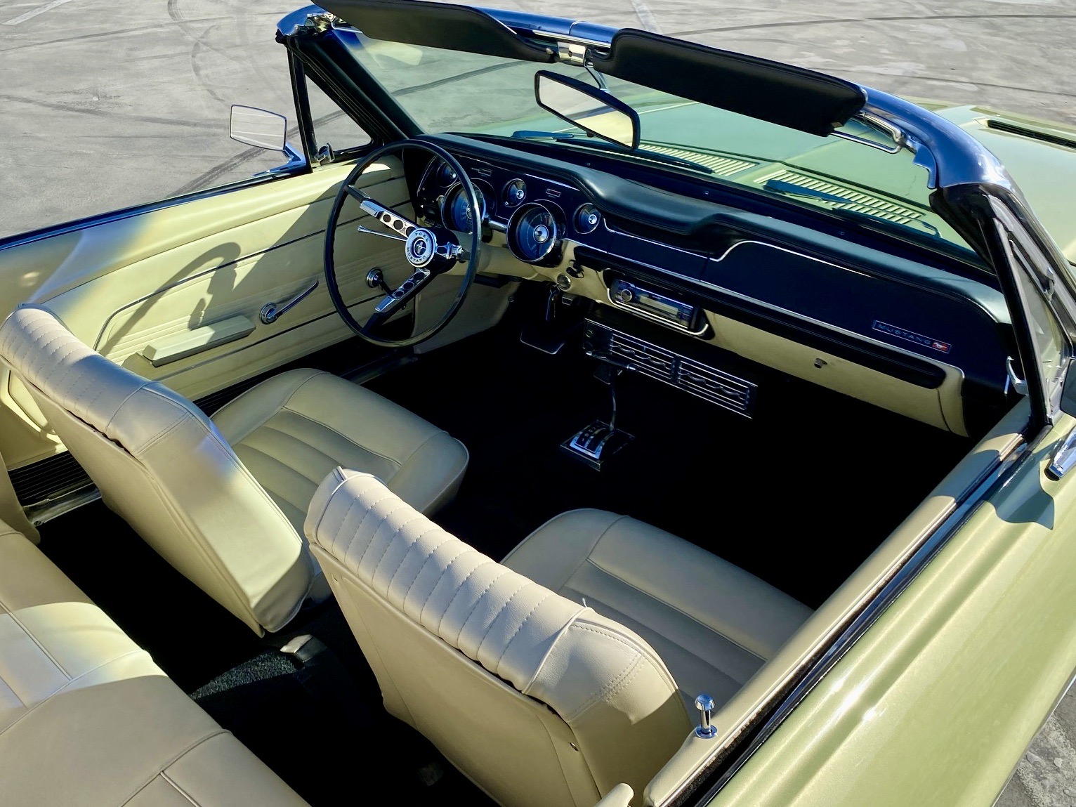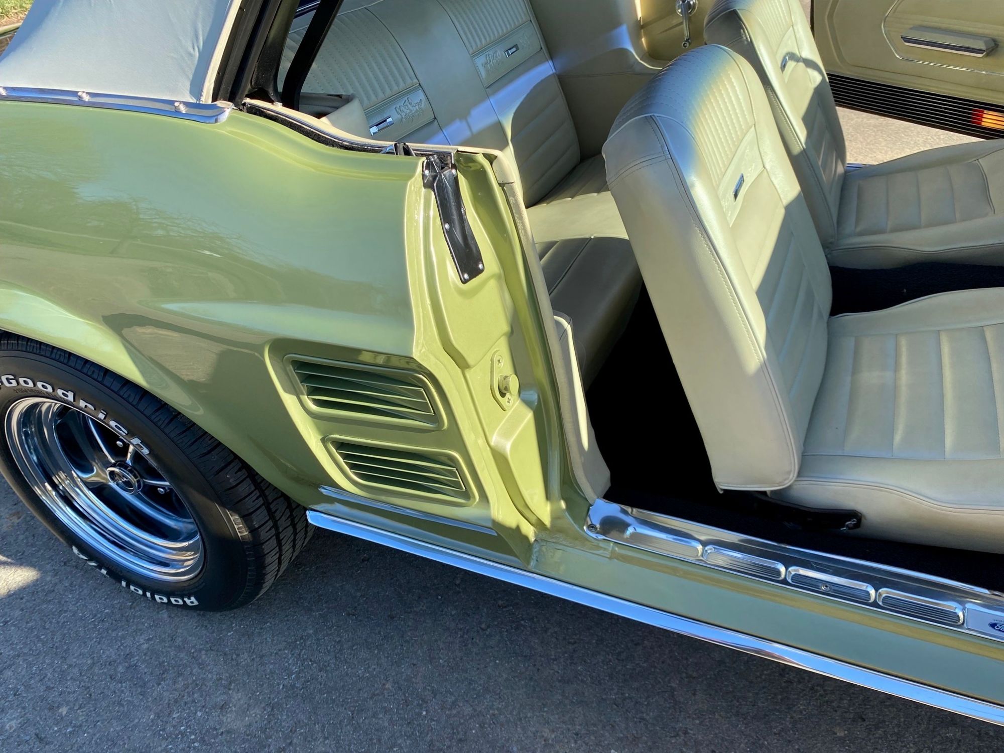 Helena ist eine exklusive Pony-Dame die jeglichen Luxus zu bieten hat. Super schöne Lackierung in der originalen Farbe "lime gold", ein nahezu neuwertiges, creme-weisses Verdeck, eine toll erhaltene, abgestimmte Pony-Ausstattung Ton in Ton und perfekte Chromteile dazu, dies nur zum Thema Optik. Technisch gesehen fehlt ebenso nichts, die edle Dame hat Servolenkung, Power Brakes, ein elektrisches Verdeck und sogar eine Klimaanlage. Auch Geräusch-technisch ist Helena ganz vorne, die Doppelrohr-Auspuffanlage fabriziert einen absolut umwerfenden Sound. Der Sommer kann kommen.