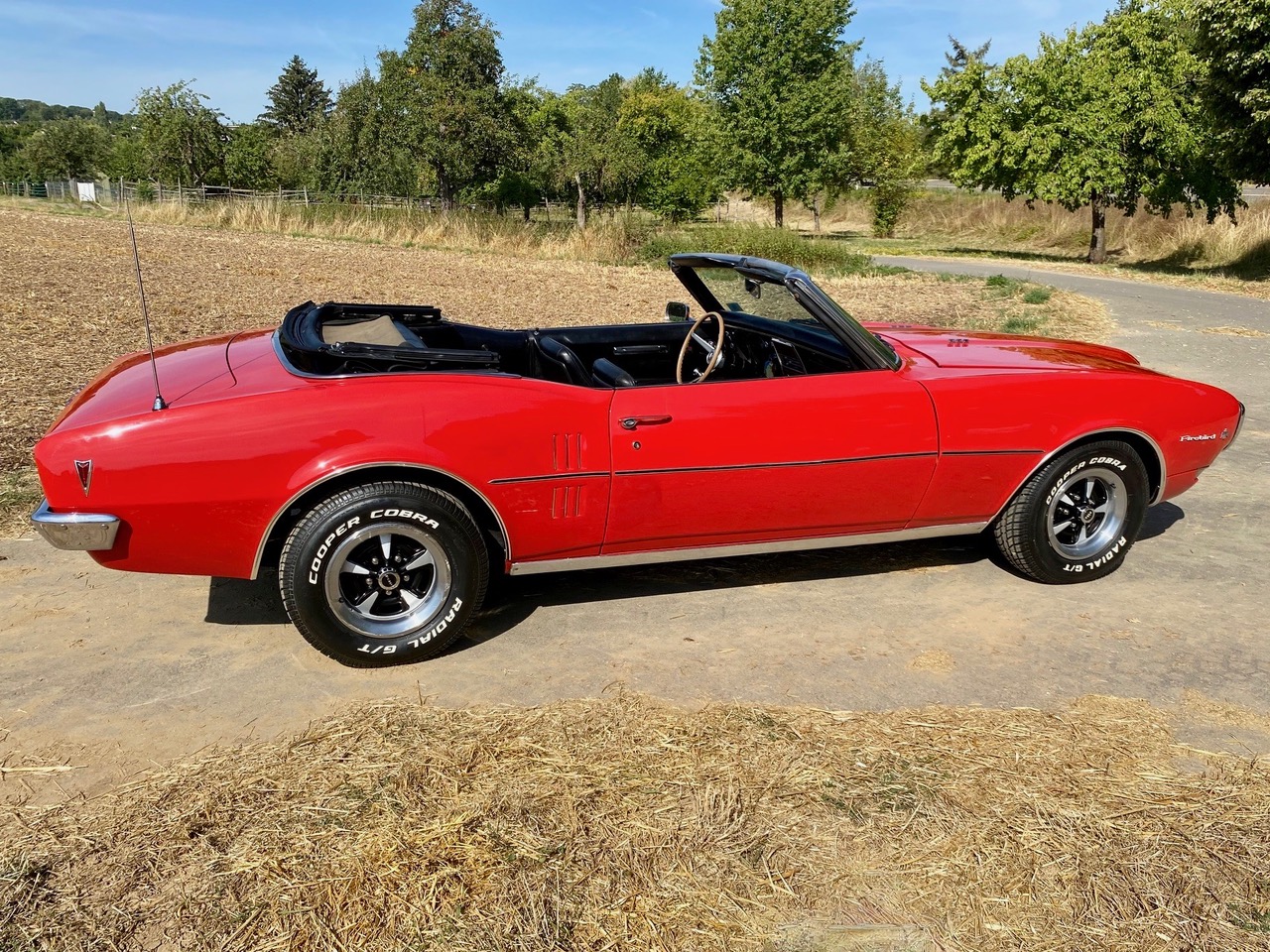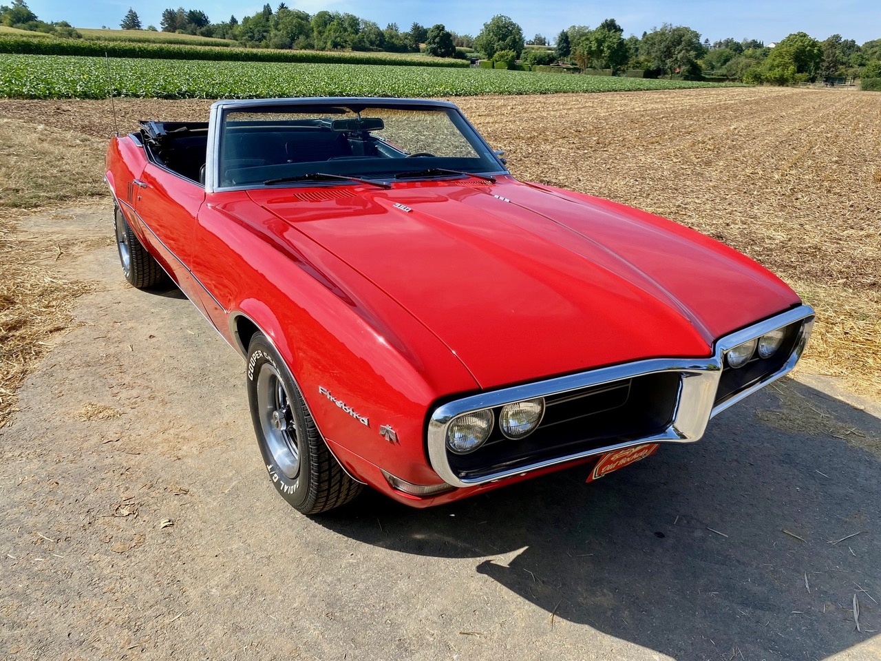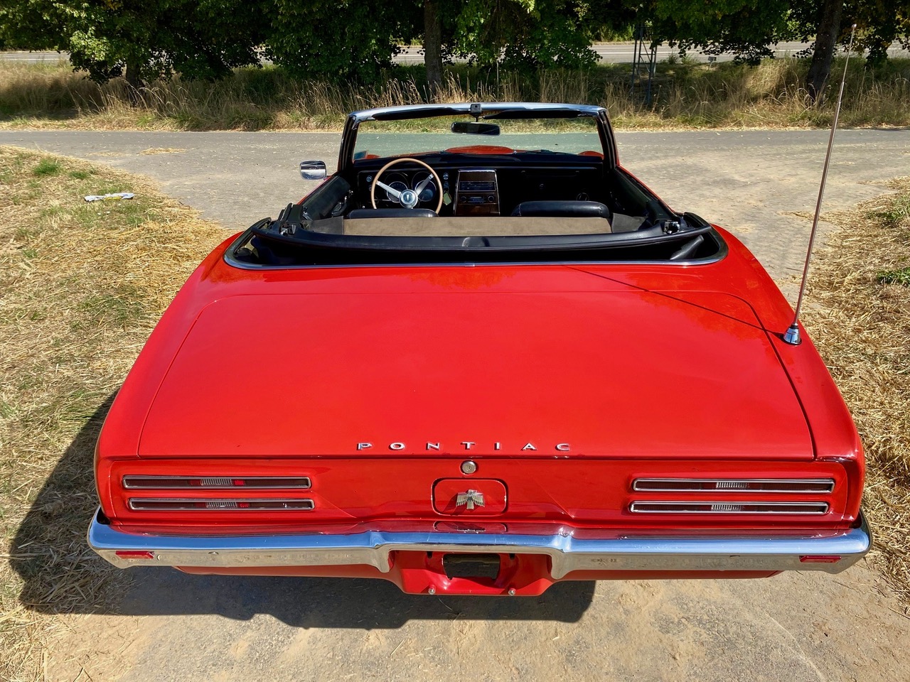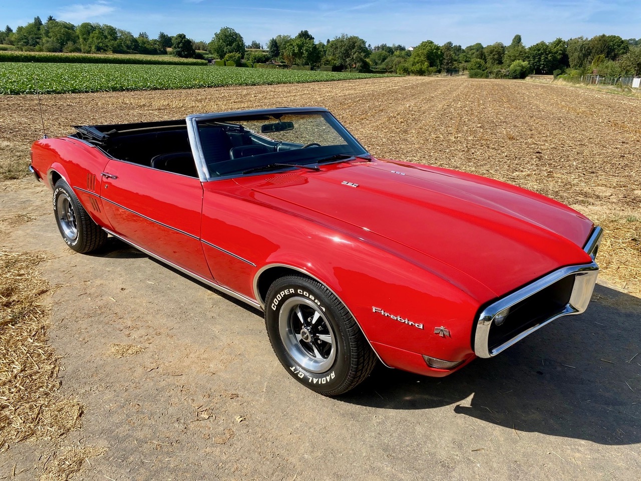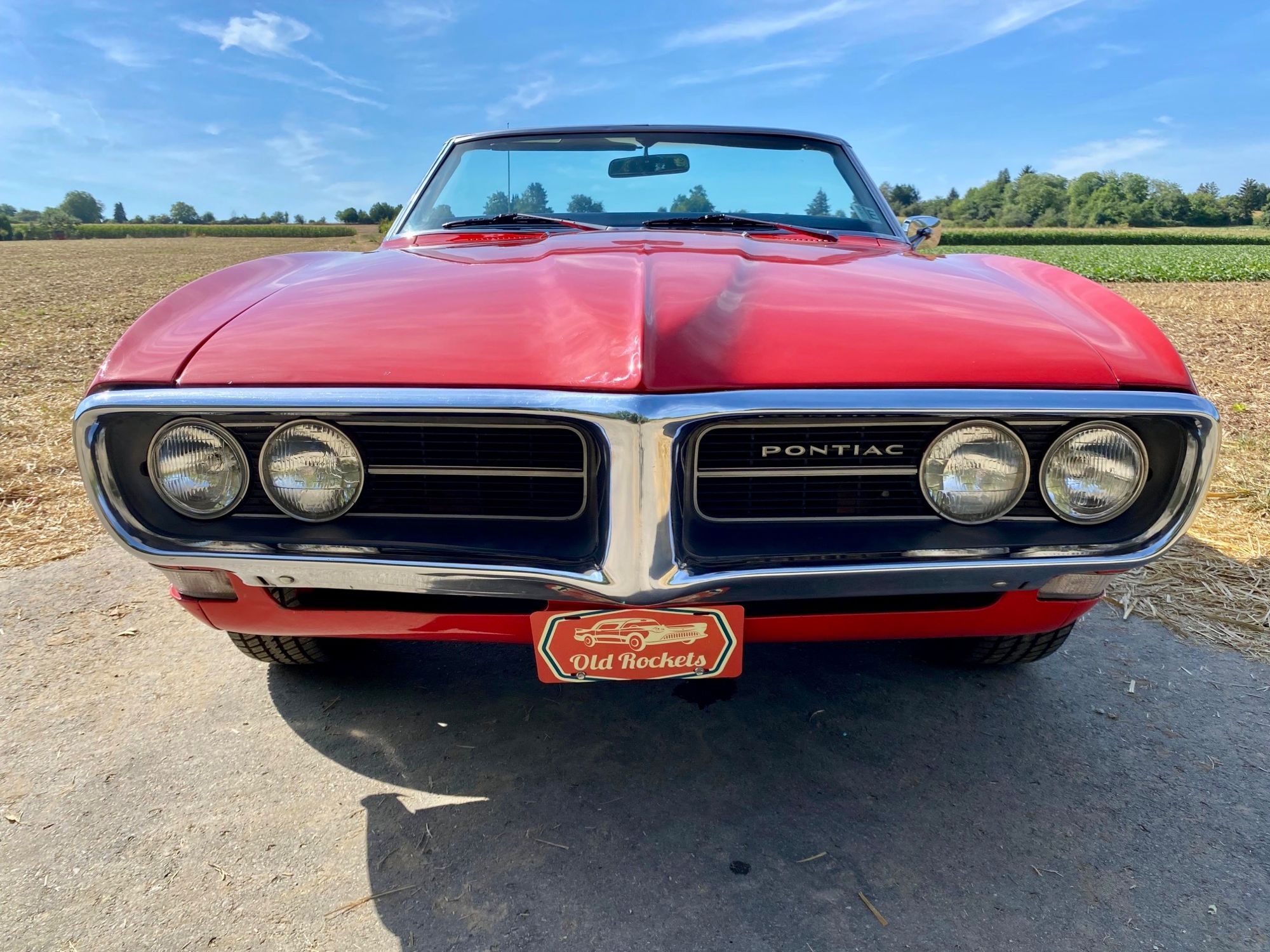 1968 Pontiac Firebird Cabrio mit 350 V8 Motor (matching numbers). Der Vorbesitzer hatte den Wagen 49 Jahre lang, die 98.000 Meilen sind laut seiner Aussage original, vermutlich hatte der Wagen wirklich nur 2 Besitzer. Technisch wurde viel investiert, Verschleissteile wie Stoßdämpfer und Dichtungen sind gewechselt, ein neuer Doppelrohr-Auspuff wurde eingebaut. Der rote Feuervogel hat nun TÜV, H-Zulassung und einen tollen Sound. Der Lack ist nichts für Perfektionisten, ganz sicher aber für Menschen die eine tolle Patina schön finden.