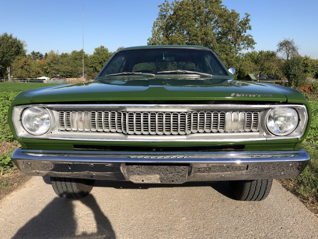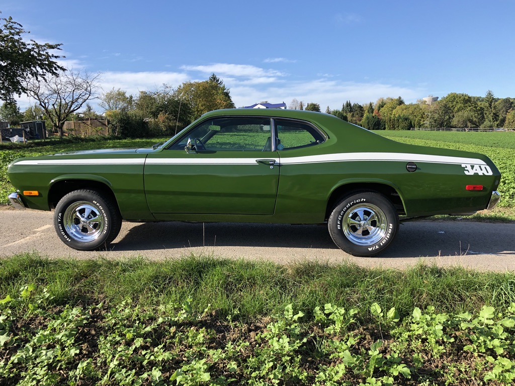 This is Kermit, ein froschgrüner Plymouth Duster, der sich im Laufe seines Lebens in einen grünen Flitze-Prinzen verwandelt hat! Fächerkrümmer, Saugrohr und ein stärkerer Vergaser sorgen gemeinsam dafür, dass der begehrte, seltene und Leistungsstarke 340 V8 Motor mit 5,6 Litern noch schneller flitzt. Ein Sharktooth-Grill und das Fliessheck helfen auch noch mit und der Tritt auf das Gaspedal verursacht dann noch einen super coolen sound. Kermit ist kein Auto für schwache Nerven und nur für eingefleischte MOPAR-Fans, blubbern oder tuckern ist nichts für den kleinen, leichten PS-Prinzen und hier gilt: "Gib Gas ich will Spaß".