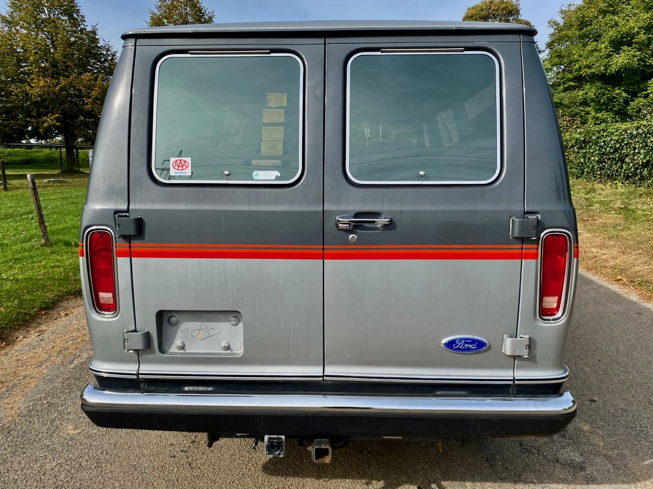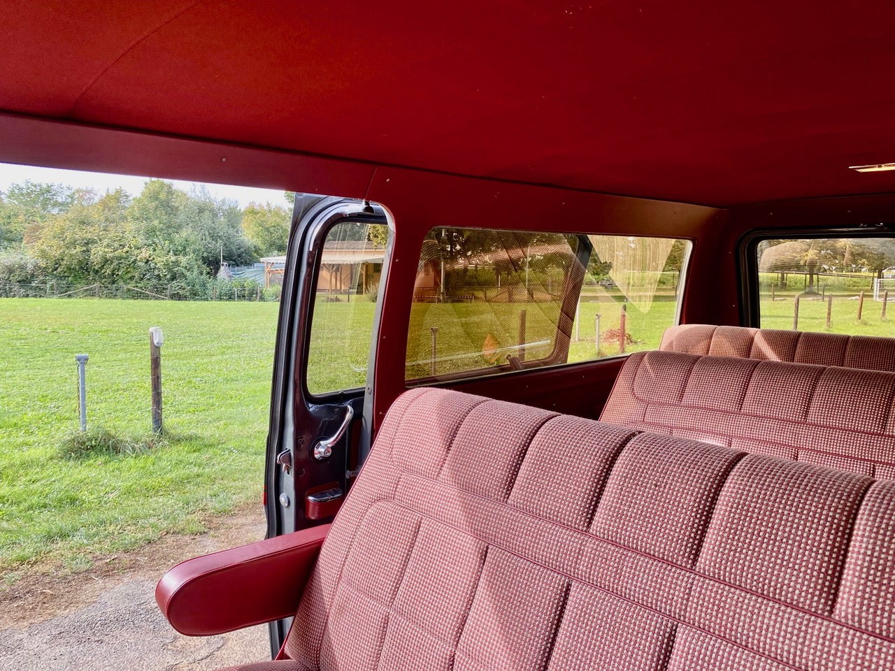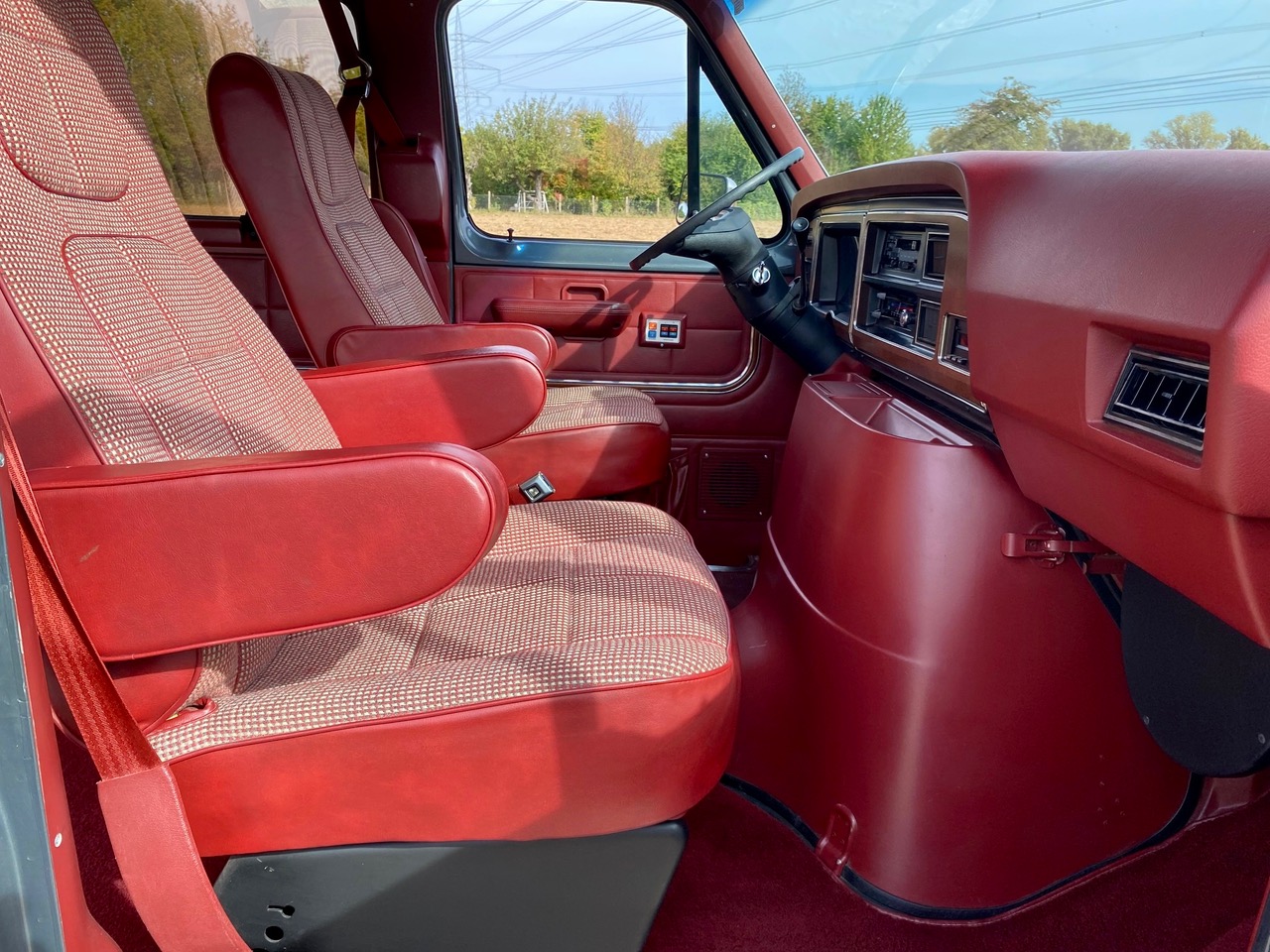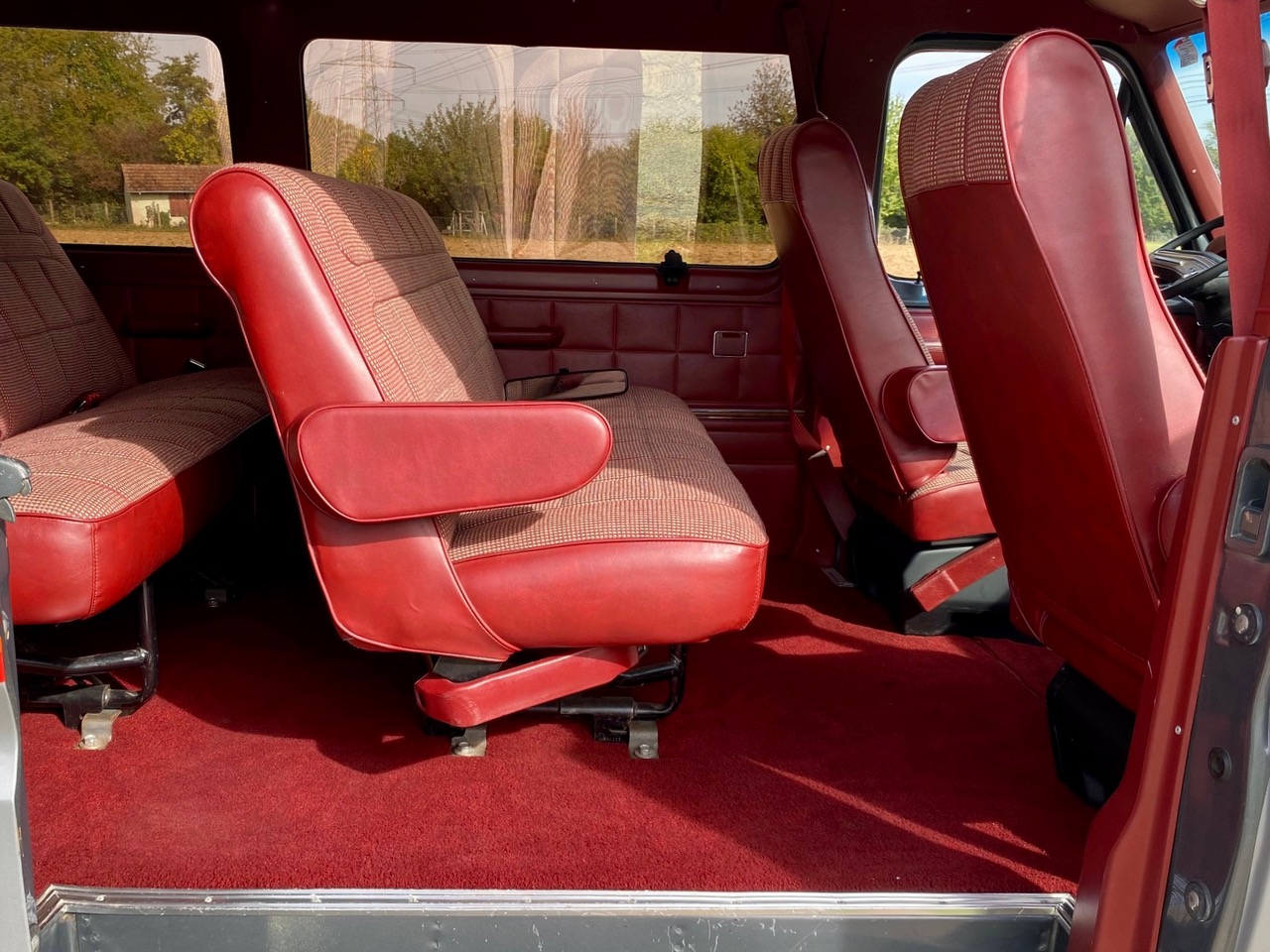 Hier kommt die amerikanische Antwort auf unseren deutschen VW-Bus, einer der beliebtesten Vans in USA. Sicherlich in diesem Zustand sehr selten zu finden, ein ganz originaler Ford E-250 XLT Club Wagon in der originalen two-tone Lackierung. Mit dabei ist die ebenso originale, super erhaltene, rote Innenausstattung. Platz für ingesamt 7 Personen, ausgestattet mit dem größten Motor den es damals gab, ein fetter 460 V8-Motor mit 7,5 Litern. Fahrendes Wohnzimmer für eine große Familie, Haus mit 4 Rädern für alle Fälle, Shopping, Baumarkt, Theater - dieser Van macht ALLES mit und ist Freund und Helfer für jeden Anlass. Nachweisbar hatte dieser Wagen nur einen Besitzer und die 32.620 Meilen sind echt.
