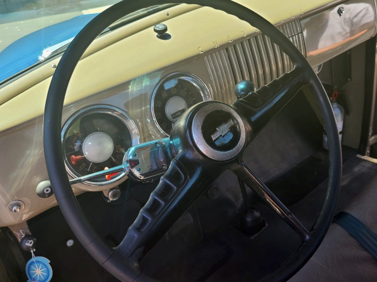 The 1954 had significant design changes. Windshield curved, one-piece glass without center vertical dividing strip. Revised steering wheel. Revised dashboard. Tail lights round instead of rectangular. Grille changed from five horizontal slats to crossbar design commonly referred to as a "bull nose" grille, similar to modern Dodge truck grille.