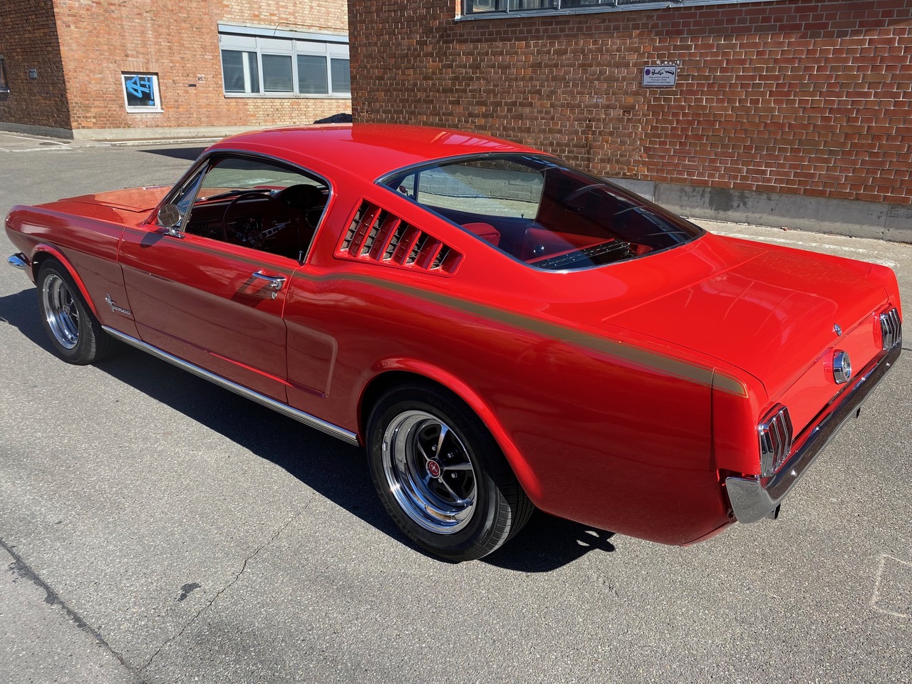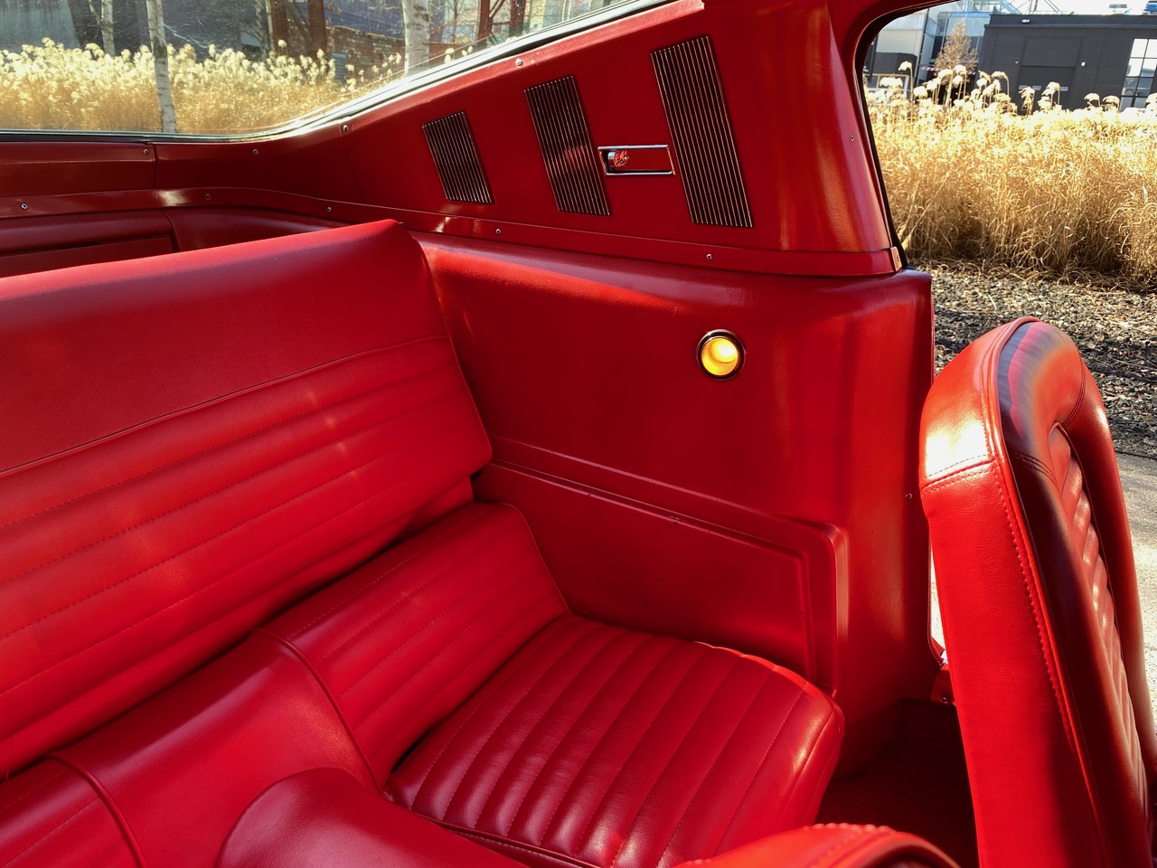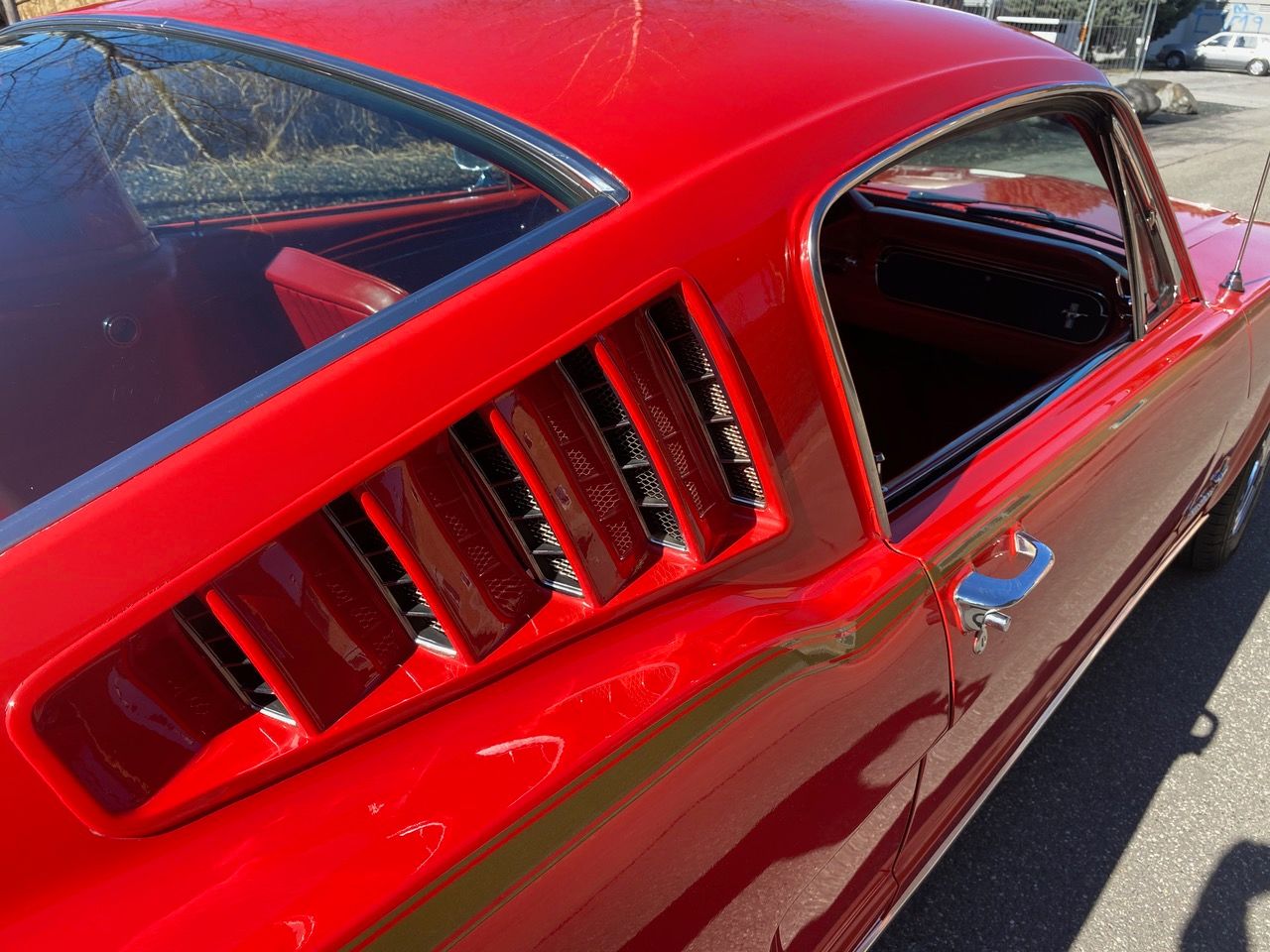 Flash ist ein waschechter Fastback in rot, rot rot. Die Farbkombination alleine lässt Stielaugen wachsen. Lackiert in der Geburtsfarbe "Rangoon Red" mit roter Innenausstattung. Gemischt mit Automatik, Scheibenbremsen, Servolenkung und einem Doppelauspuff, der alle Beteiligten mit coolem Sound versorgt. Ein traumhafter Unterboden versetzt TÜV-Prüfer in gute Laune und spätestens beim Blick in den Motorraum muss man erkennen, dass es sich hier um einen Hengst handelt. Klassiker, Kult, Wertanlage - wir sind jedenfalls stolz, dass er bei uns im Stall einziehen durfte.