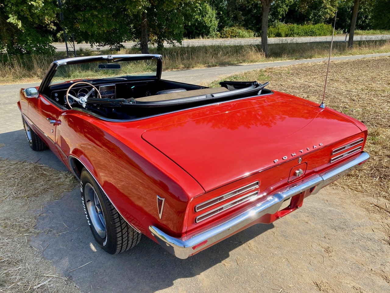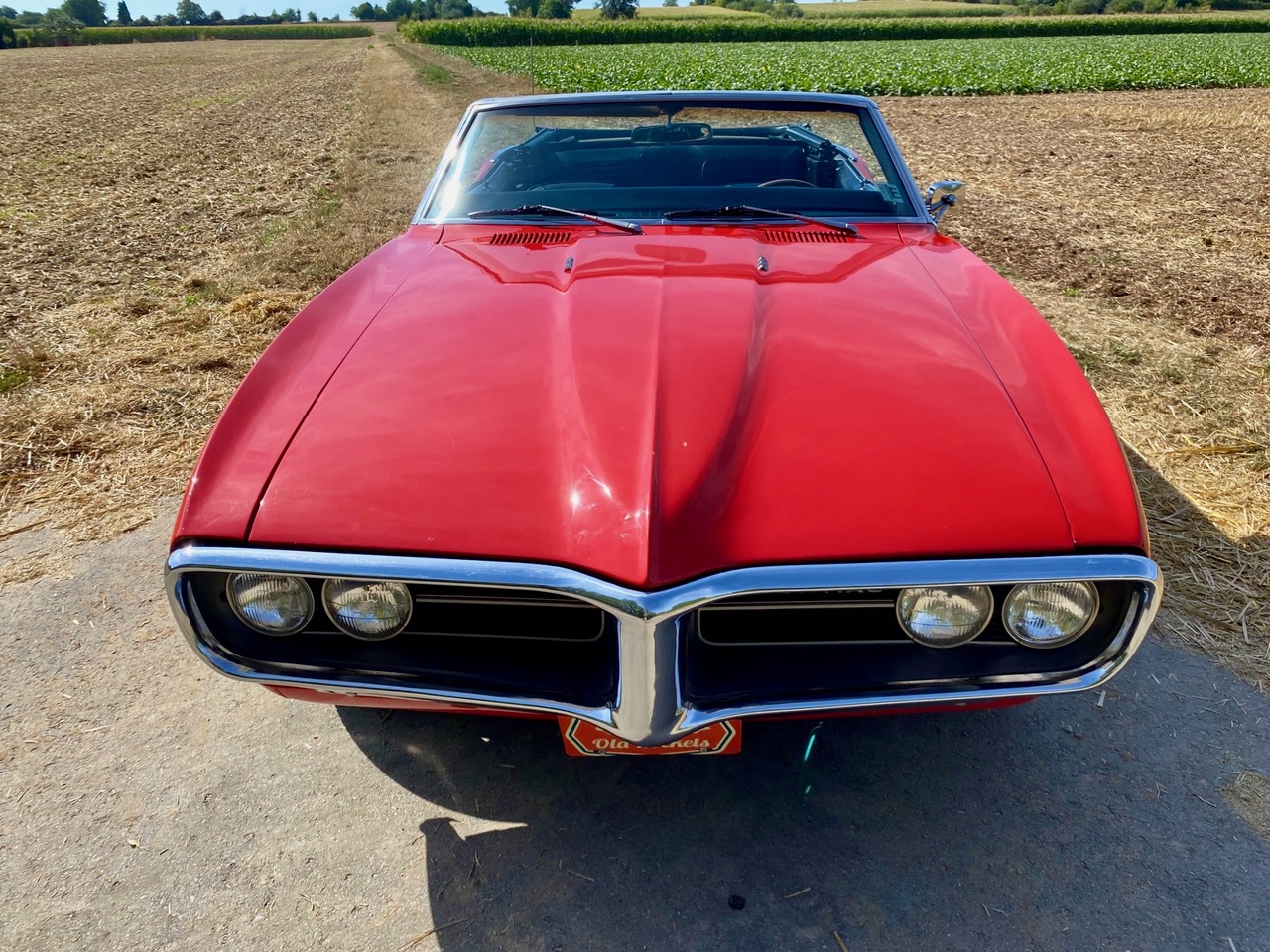 1968 Pontiac Firebird Cabrio mit 350 V8 Motor (matching numbers). Der Vorbesitzer hatte den Wagen 49 Jahre lang, die 98.000 Meilen sind laut seiner Aussage original, vermutlich hatte der Wagen wirklich nur 2 Besitzer. Technisch wurde viel investiert, Verschleissteile wie Stoßdämpfer und Dichtungen sind gewechselt, ein neuer Doppelrohr-Auspuff wurde eingebaut. Der rote Feuervogel hat nun TÜV, H-Zulassung und einen tollen Sound. Der Lack ist nichts für Perfektionisten, ganz sicher aber für Menschen die eine tolle Patina schön finden.