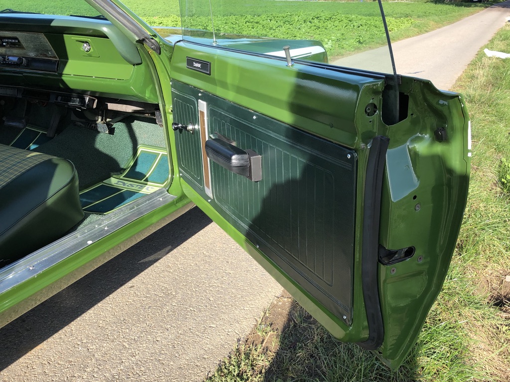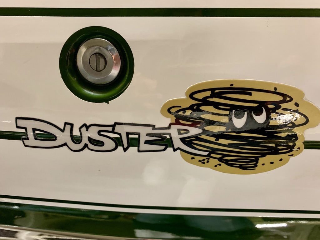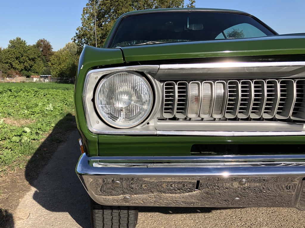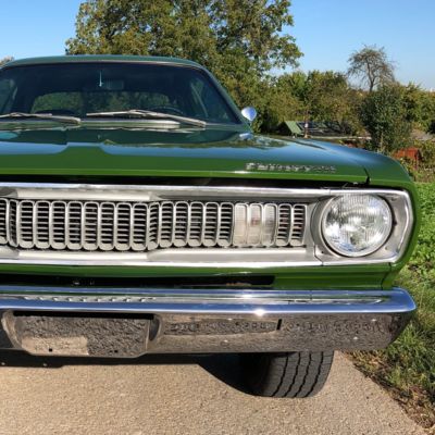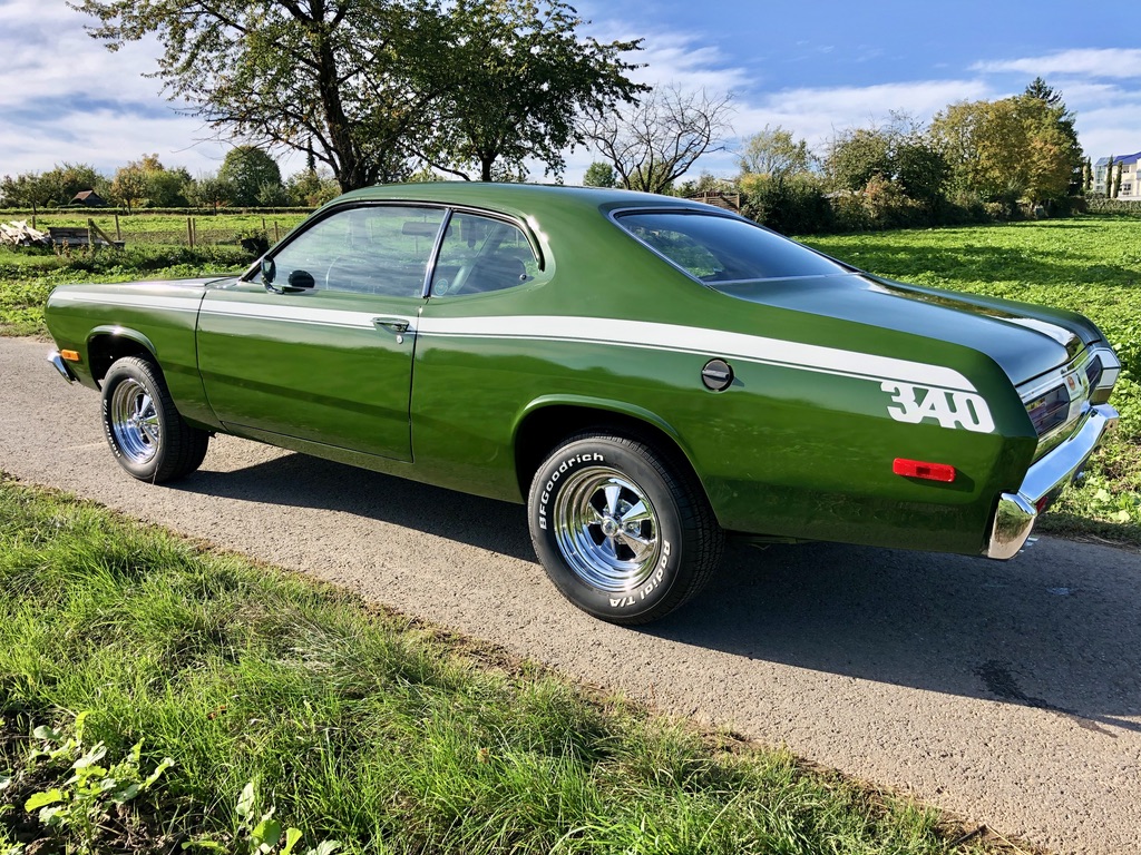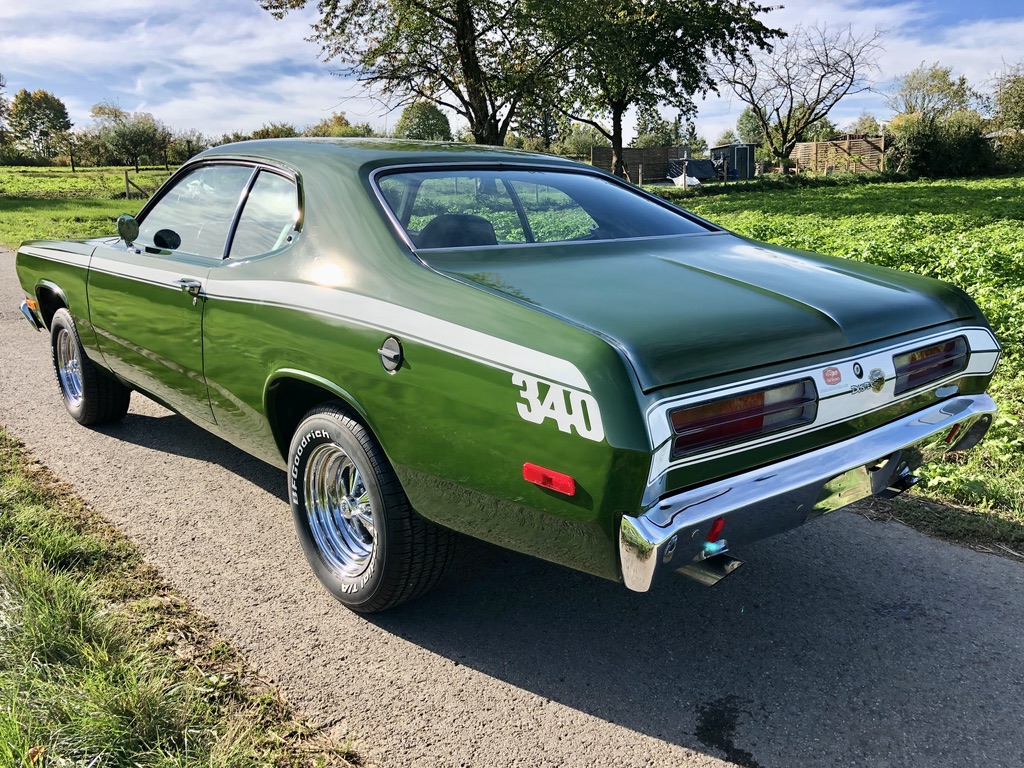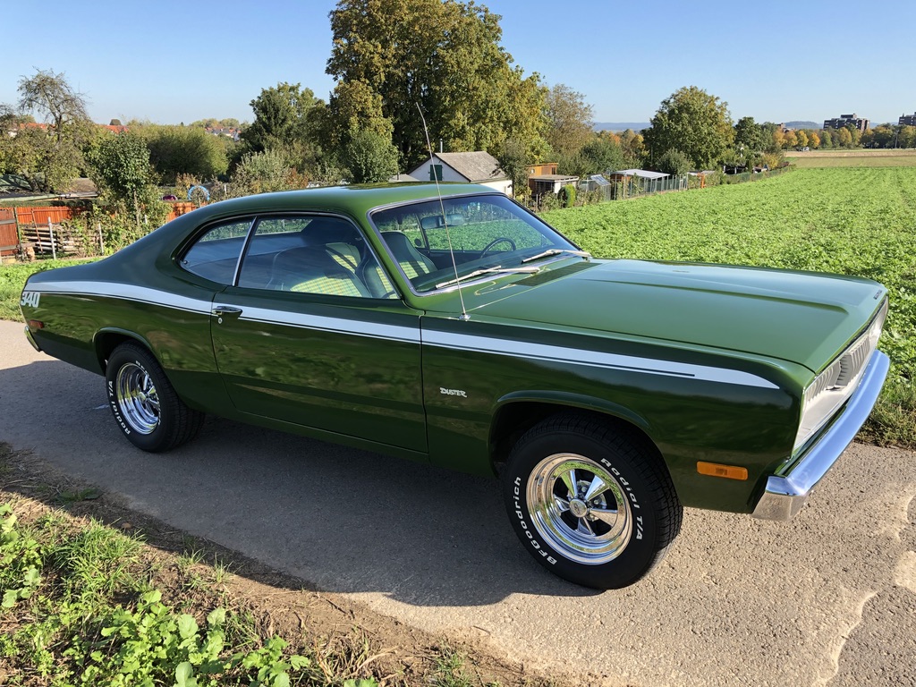 This is Kermit, ein froschgrüner Plymouth Duster, der sich im Laufe seines Lebens in einen grünen Flitze-Prinzen verwandelt hat! Fächerkrümmer, Saugrohr und ein stärkerer Vergaser sorgen gemeinsam dafür, dass der begehrte, seltene und Leistungsstarke 340 V8 Motor mit 5,6 Litern noch schneller flitzt. Ein Sharktooth-Grill und das Fliessheck helfen auch noch mit und der Tritt auf das Gaspedal verursacht dann noch einen super coolen sound. Kermit ist kein Auto für schwache Nerven und nur für eingefleischte MOPAR-Fans, blubbern oder tuckern ist nichts für den kleinen, leichten PS-Prinzen und hier gilt: "Gib Gas ich will Spaß".