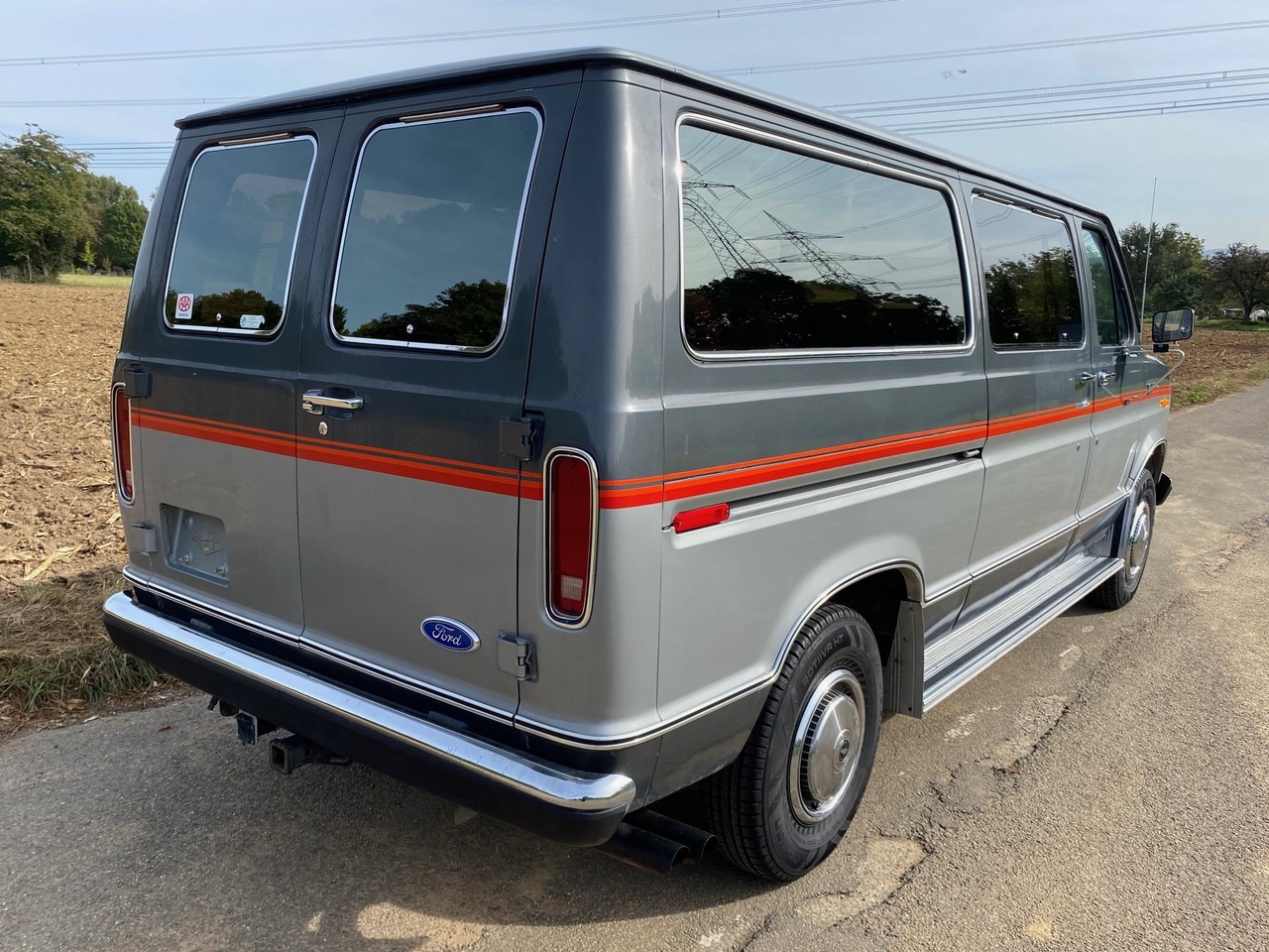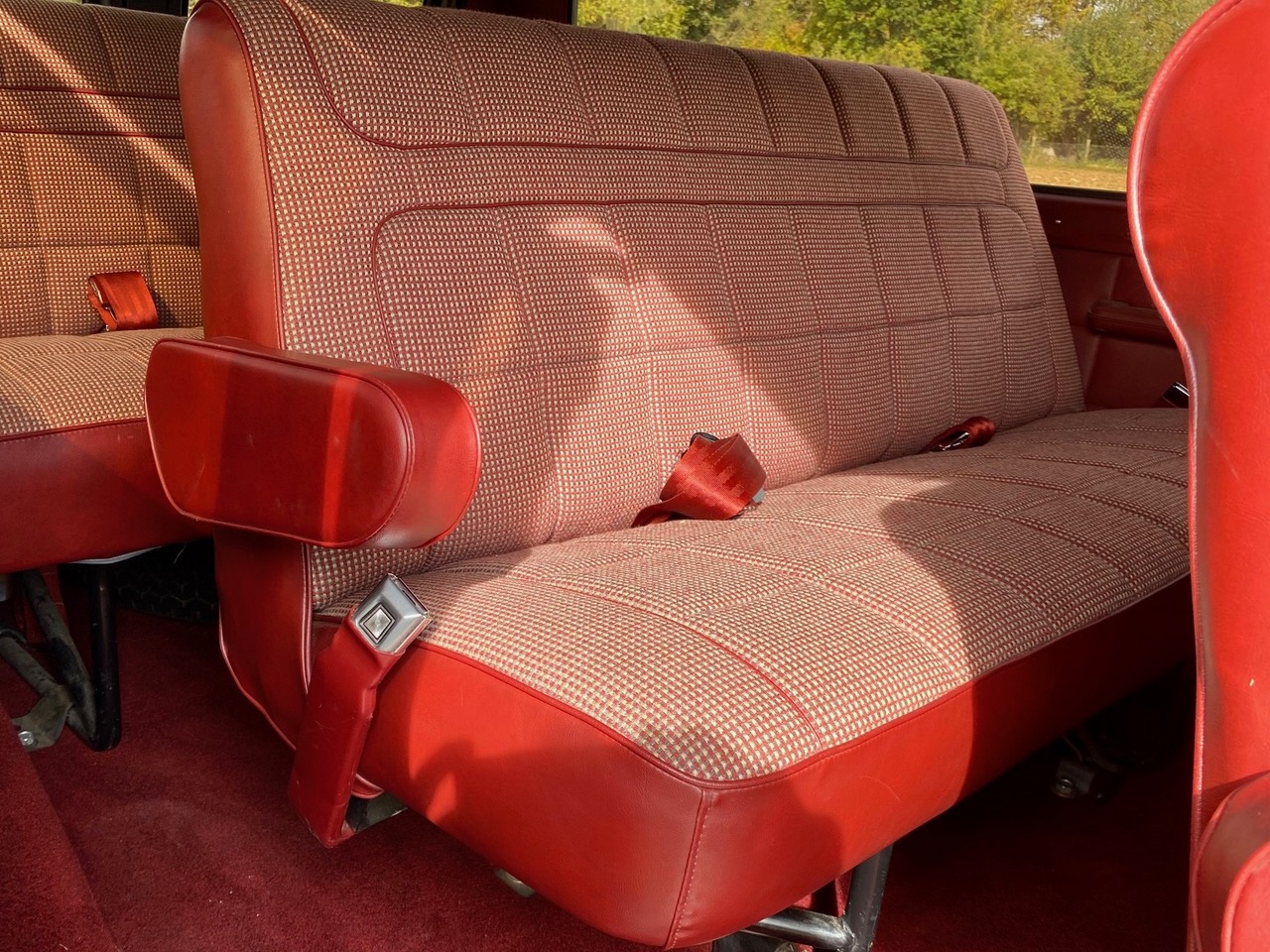 Hier kommt die amerikanische Antwort auf unseren deutschen VW-Bus, einer der beliebtesten Vans in USA. Sicherlich in diesem Zustand sehr selten zu finden, ein ganz originaler Ford E-250 XLT Club Wagon in der originalen two-tone Lackierung. Mit dabei ist die ebenso originale, super erhaltene, rote Innenausstattung. Platz für ingesamt 7 Personen, ausgestattet mit dem größten Motor den es damals gab, ein fetter 460 V8-Motor mit 7,5 Litern. Fahrendes Wohnzimmer für eine große Familie, Haus mit 4 Rädern für alle Fälle, Shopping, Baumarkt, Theater - dieser Van macht ALLES mit und ist Freund und Helfer für jeden Anlass. Nachweisbar hatte dieser Wagen nur einen Besitzer und die 32.620 Meilen sind echt.