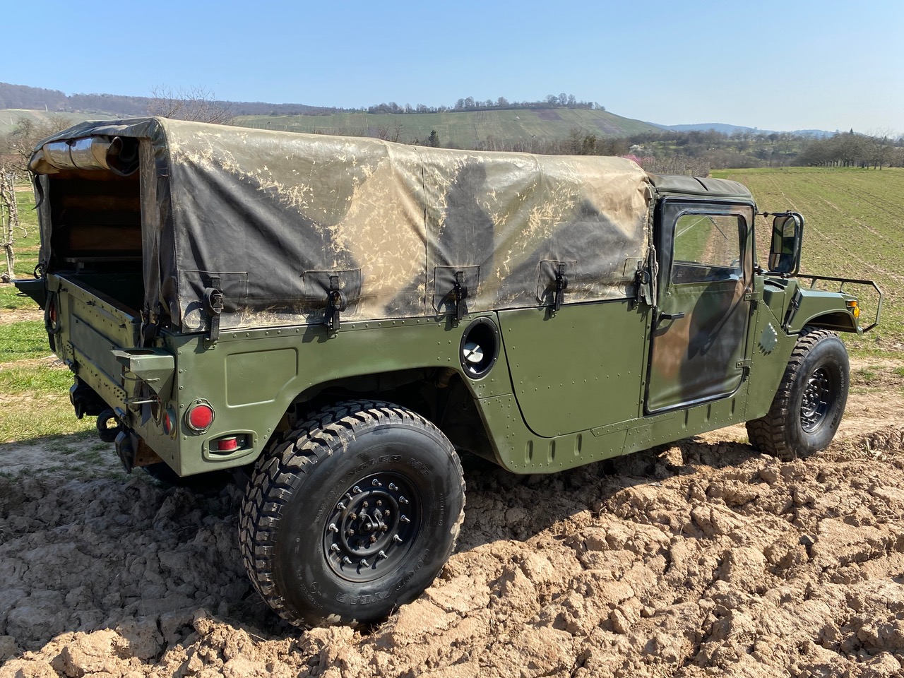 Mad Max, ein 1987 AM General M998, Humvee, HMMWV. Dieser Bub hat eine originale "troop carrier bench" (für 8 Personen) und ein Cargo Cover mit Gestänge mitgebracht, somit ist das eigene Zelt immer mit dabei. Die Plane sowie die Seitenwände aus Holz und die Sitzbänke können abgenommen werden. In der Fachwerkstatt gab es eine komplette Durchsicht, einen neuen Tank, eine neue Bremsanlage, eine Komplettüberholung des Lenkgestänges, dazu noch TÜV, Oldtimerzulassung und vieles mehr. Zulassungsfertig, legal für die Strasse und bereit für alle Späße in Matsch, Schnee und Gelände.
